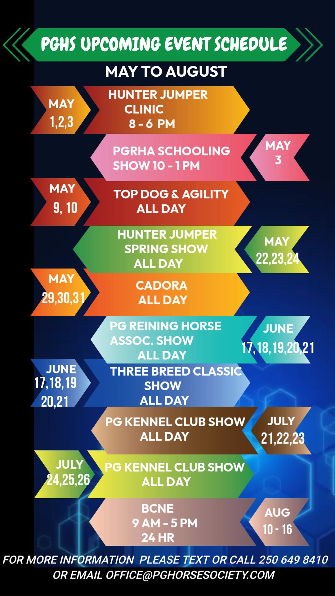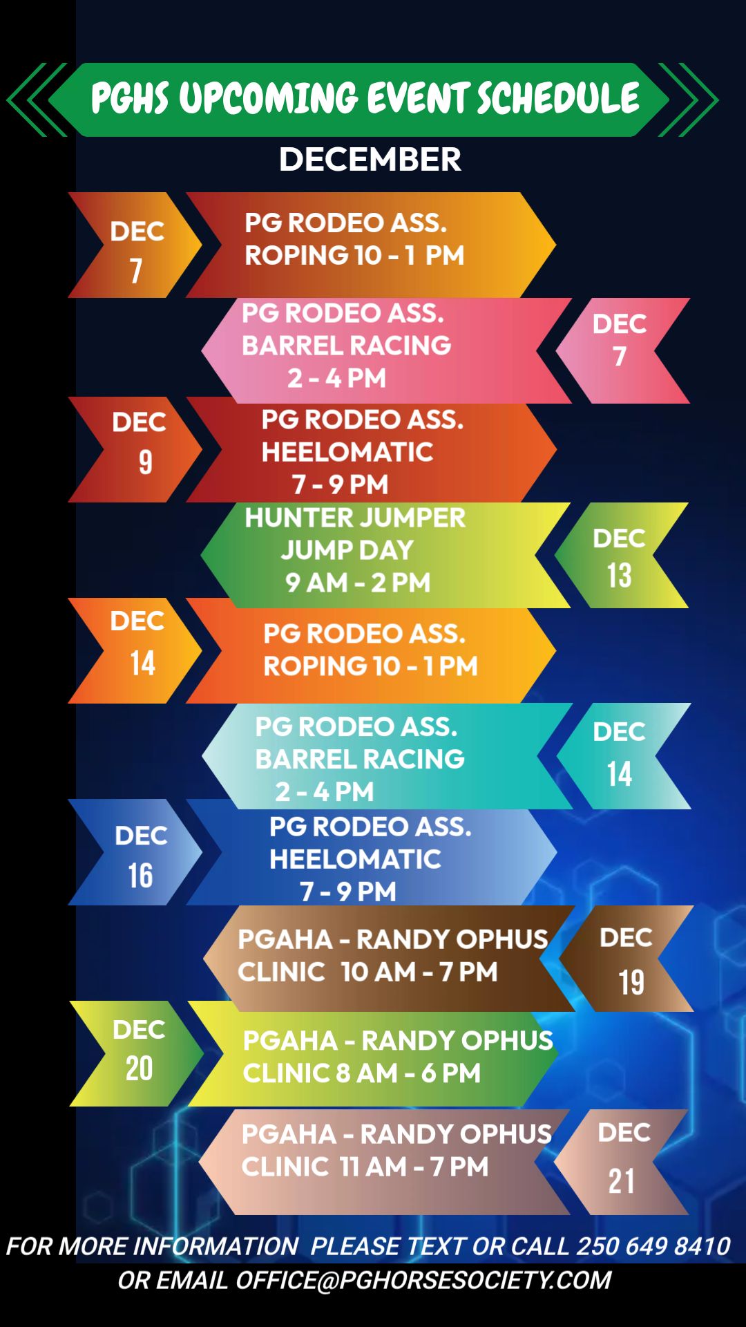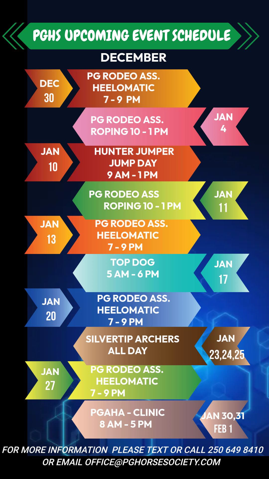 The Prince George Horse Society (PGHS) is a non profit organization formed in 1996 to promote the recreational, social and education benefits of the equine disciplines and accessibility to equine pursuits for the residents of Prince George British Columbia and surrounding area.